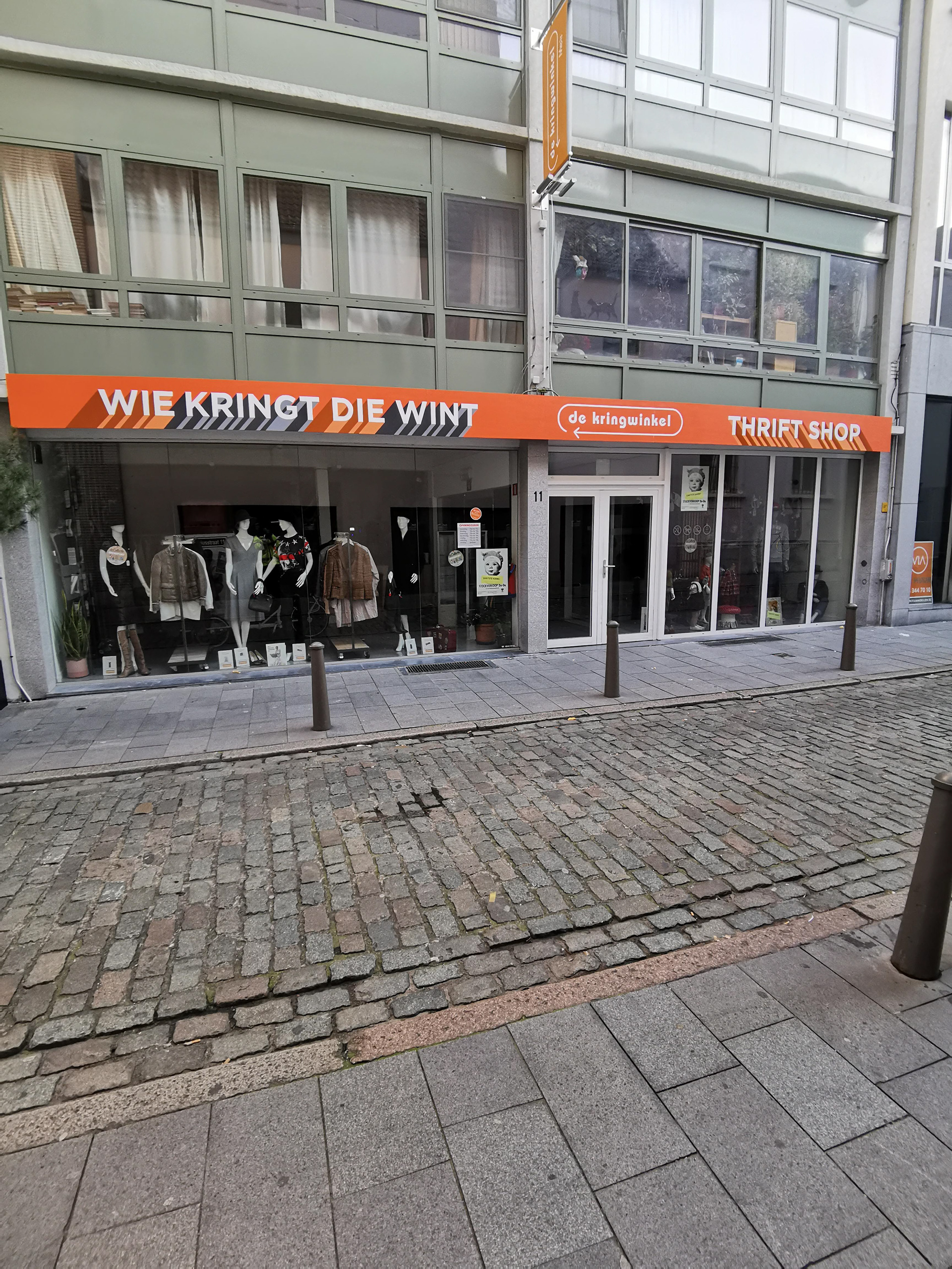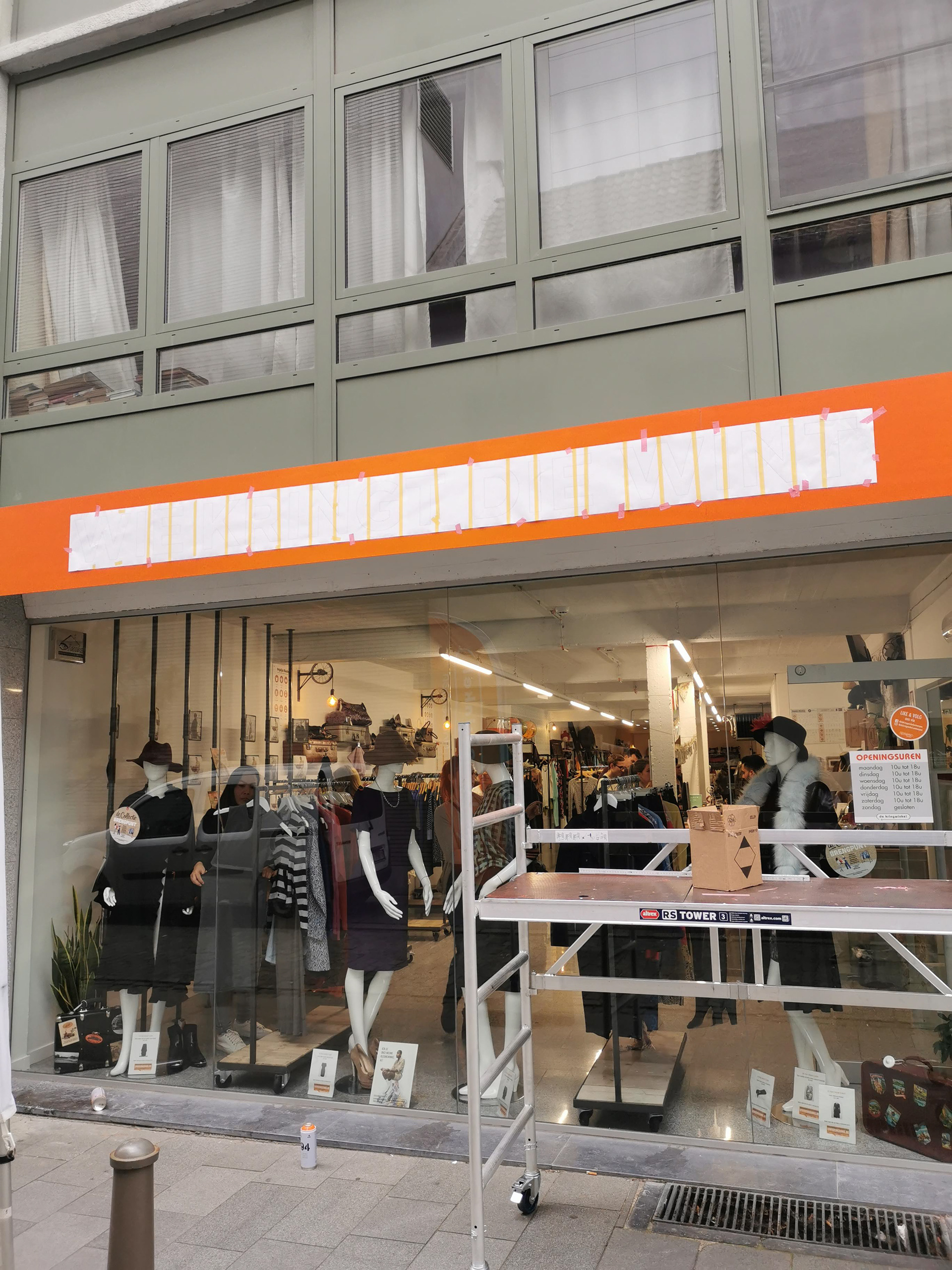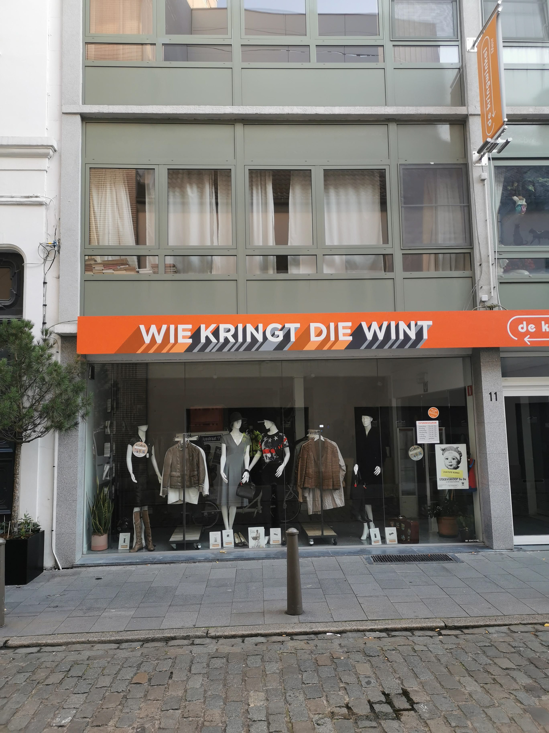 Ontwerp en plaatsing van winkelsignalisatie voor de Kringwinkel Antwerpen. Handgeschilderd.